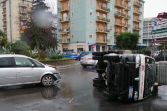 Furgone si ribalta dopo scontro in via Turati. Anziana contro muro in via Monaco