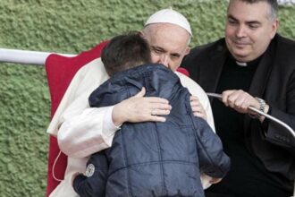Il commovente abbraccio di Francesco con il piccolo Emanuele: “Piango perché mio papà era ateo e non c’è più”