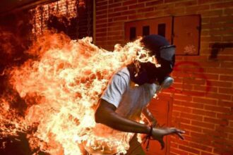 Un ragazzo venezuelano avvolto dalle fiamme da cui cerca di scappare. Una…