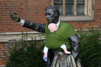 Fasce portabebè sulle statue: la protesta creativa dei papà che vogliono un congedo più lungo