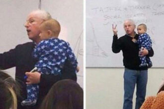 Virale foto del prof in aula col bimbo di un'allieva in braccio