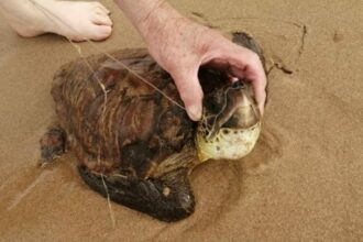 Una tartaruga marina comune (Caretta-caretta) con un amo infilzato nella gola è stata…