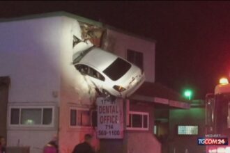California, auto a folle velocità prende il volo e resta incastrata nellʼedificio