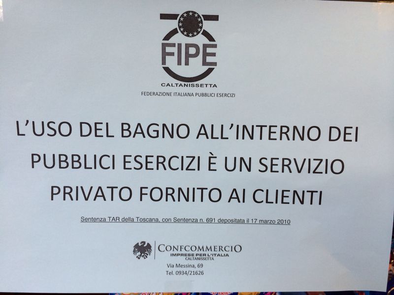 Il bisognino impellente che scappa durante la processione? Se non consumi nei bar, vietato entrare nella toilette. Toni duri quelli usati dalla Fipe di Confcommercio Caltanissetta, la federazione dei pubblici esercizi guidata da Siller Pilato, che ha deciso di protestare pubblicamente contro la solita disorganizzazione del Comune per non avere previsto l'installazione dei bagni chimici lungo il tragitto delle processioni previste durnate la Settimana Santa. Cartelli in cui i titolari dei bar associati a Confcommercio avvisano che “l'uso del bagno all'interno dei pubblici esercizi è un servizio privato fornito ai clienti”.