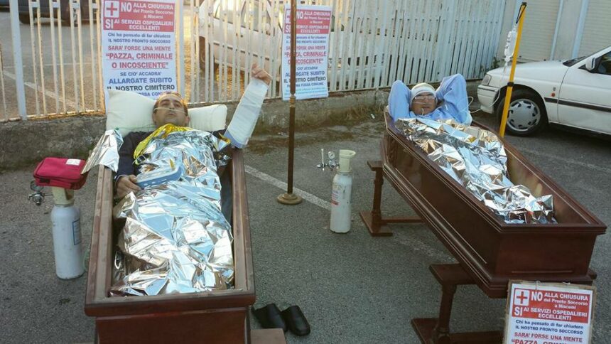 Due cittadini di Niscemi, Giuseppe Maida, insegnante, e Rosario Ristagno, presidente di un'associazione di protezione civile, si sono piazzati, dentro due bare, davanti agli uffici dell'Azienda sanitaria provinciale di Caltanissetta. Protestano contro l'annunciata chiusura del pronto soccorso dell'ospedale ‘Suor Cecilia Basarocco' di Niscemi. hanno affisso dei manifesti con le scritte “No alla chiusura del pronto soccorso di Niscemi, Si' ai servizi ospedalieri eccellenti”, “Chi ha pensato di fare chiudere il nostro pronto soccorso sara' forse una mente pazza, criminale o incosciente”. Maida sostiene che in caso di chiusura, “servira' al cimitero di Niscemi una fossa comune”.