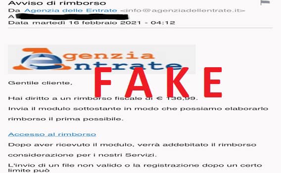 La falsa email, al fine di trarre in inganno gli ignari utenti, invita a cliccare su un link per ricevere un presunto rimborso.