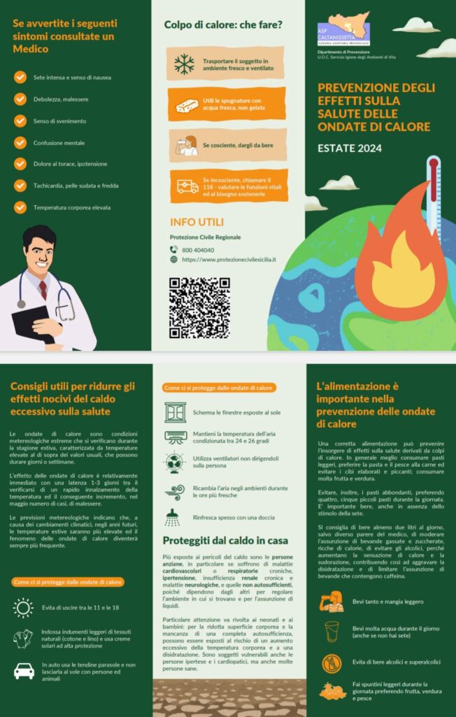 Questi sono alcuni dei consigli presenti nella brochure, realizzata dal Dipartimento di Prevenzione U.O.C. Servizio Igiene degli Ambienti di Vita dell'A.S.P. di Caltanissetta, contenente delle indicazioni per la prevenzione degli effetti sulla salute delle ondate di calore. Il Dipartimento di Prevenzione ha infatti elaborato un Piano Operativo Locale per la Prevenzione degli Effetti delle Ondate di Calore, in ottemperanza alle linee guida nazionali del Ministero della Salute ed alle direttive regionali riguardanti il sistema di sorveglianza e prevenzione degli effetti delle ondate di calore in Sicilia.