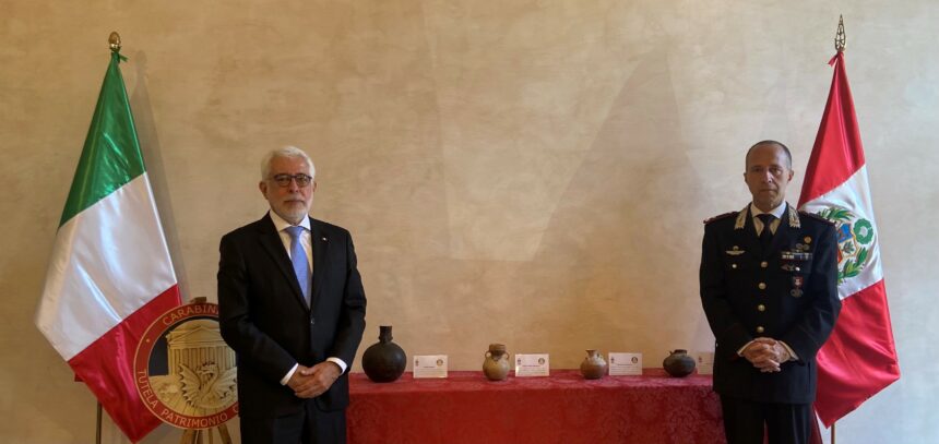 Il 22 luglio 2021 nella Caserma “La Marmora” in Via Anicia 24 a Roma, il Generale di Brigata Roberto Riccardi, Comandante dei Carabinieri per la Tutela del Patrimonio Culturale, ha restituito a S.E. Julio Eduardo Martinetti Macedo, Ambasciatore del Perù a Roma, quattro beni culturali appartenenti alla Repubblica peruviana. L’indagine che ha consentito il recupero del cantaro e dell’olla in ceramica è stata condotta