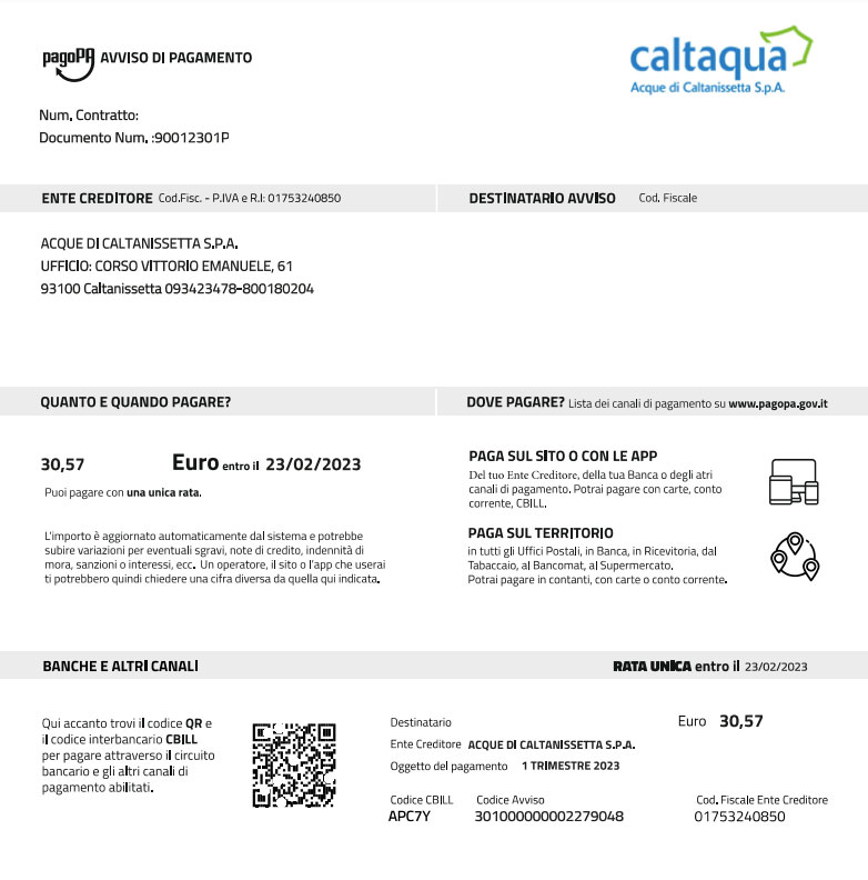 Un altro importante passo in direzione della semplificazione del dialogo con l’utenza nel segno di una maggiore efficienza dei rapporti, del risparmio di tempo e di carta. Caltaqua – Acque di Caltanissetta SpA, gestore del servizio idrico interato per il territorio della provincia di Caltanissetta, ha infatti implementato i servizi della propria area C@alt@qua online adottando come ulteriore mezzo di pagamento il sistema pagoPA accessibile con pochi click dal proprio cellulare attraverso l’app IO (in tal caso cliccare su portafoglio/paga un avviso – inquadrare il QR Code impresso nella fattura e autorizzare il pagamento) oppure utilizzando l’app del proprio istituto di credito (in tal caso occorre cliccare su bollettini CBILL, inquadrare il QR Code impresso nella fattura e autorizzare il pagamento). In questo modo si eviteranno le file agli sportelli con evidenti benefici nella gestione quotidiana delle proprie attività.