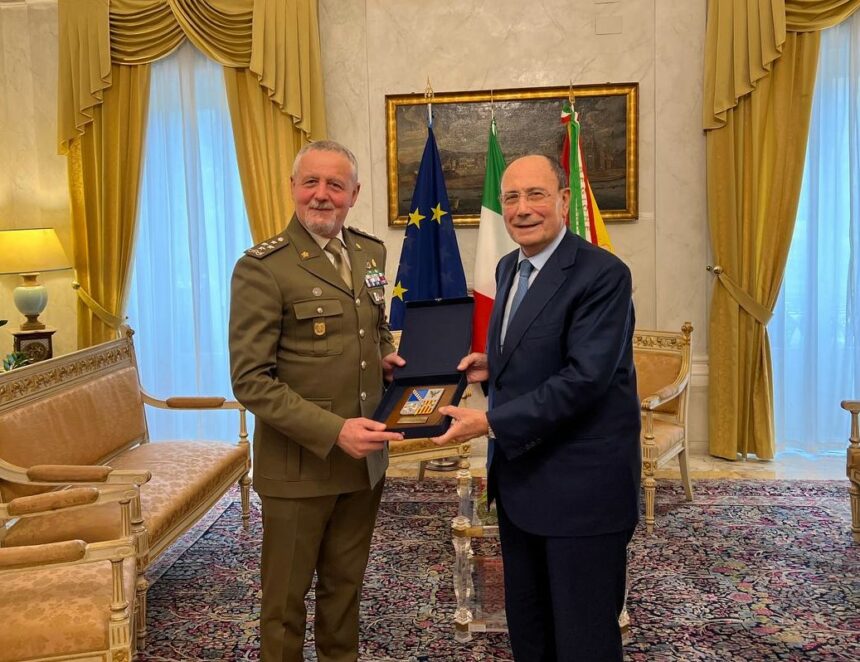 Visita di cortesia, a Palazzo d’Orleans, del capo di Stato maggiore dell'Esercito, il generale di corpo d'armata Pietro Serino. A riceverlo il presidente della Regione Siciliana, Renato Schifani. Ad accompagnare l’alto ufficiale anche i generali Giuseppenicola Tota, comandante delle Forze operative Sud, e Angelo Maurizio Scardino, comandante militare dell’Esercito in Sicilia. Il presidente si è intrattenuto a lungo con i militari e al termine del colloquio ha offerto in dono il crest con i simboli della Regione Siciliana e ricevuto quello dell’Esercito.