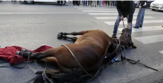 Nelle immagini si vedono alcune persone, fra cui alcuni vetturini, intenti a tagliare le briglie per liberare l’animale steso sull’asfalto. Dopo alcuni minuti sono riusciti a rimettere in piedi l’animale. Momenti concitati nei quali qualche vetturino si sarebbe avvicinato a una donna che stava riprendendo la scena invitandola, con toni tutt’altro che amichevoli, a cancellare le immagini. La signora è stata costretta a rifugiarsi all’interno di una attività commerciale.