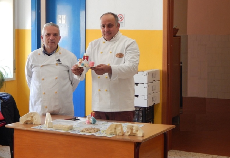 Per il secondo anno consecutivo la dirigente scolastica Francesca D’Asaro ha aperto le porte ai pasticceri Nidro, il cui laboratorio si trova in via Redentore, per mostrare ai suoi piccoli allievi come si realizzano le creazioni che si vedono dalle vetrine dei negozi. Nei prossimi giorni i due maestri ripeteranno la dimostrazione anche nei plessi dell’Aldo Moro e della Gianni Rodari.
