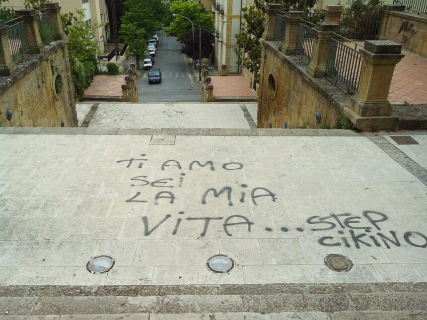 L'imbecillità sentimentale sotto forma di bomboletta spray ha “spruzzato” ancora per le strade di Caltanissetta. Stavolta la vittima non è il prospetto di un condominio o di un garage o un anonimo muro di periferia, bensì una delle scalinate più suggestive e antiche del centro storico. La gradinata “Silvio Pellico”, infatti, è stata presa di mira da un vandalo-innamorato – che si firma “Step” come il personaggio reso celebre dal libro per adolescenti “Ho voglia di te” scritto da Federico Moccia – che l'ha deturpata su due pianerottoli scrivendo la dedica alla sua morosa.