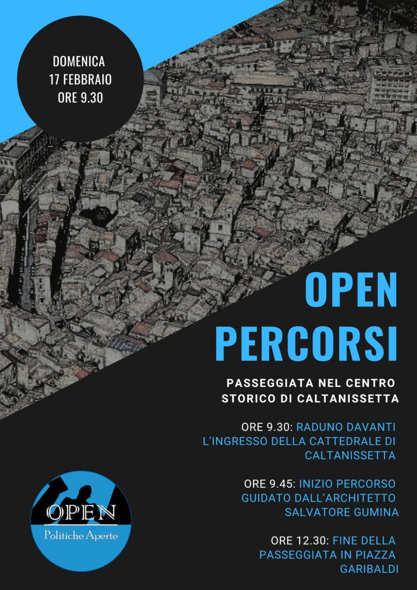 Si svolgerà domenica 17 febbraio l’evento intitolato “Percorsi OPEN. Passeggiata nel centro storico di Caltanissetta”. Organizzato dal movimento politico “OPEN politiche aperte”, l’incontro si svolgerà con il seguente programma: 9.30, raduno davanti l’ingresso della Cattedrale di Caltanissetta (chiesa Santa Maria La Nova); 9.45, inizio percorso guidato dall’architetto Salvatore Gumina; 12.30, fine della passeggiata in Piazza Garibaldi.