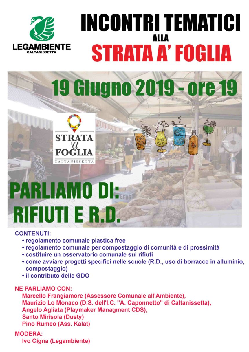 Il 19 Giugno è la volta della tematica relativa ai "Rifiuti" e alla "Raccolta Differenziata". Si parlerà: di regolamenti comunali su plastica free e compostaggio di comunità; dell'importanza di costituire un osservatorio comunale sui rifiuti; di consigli e procedure operative per avviare progetti specifici nelle scuole; di cosa può e deve fare la Grande Distribuzione Organizzata (GDO). Per tale tema sono stati invitati a discutere: Marcello Frangiamore (Assessore Comunale all'Ambiente), Pino Rumeo (Ass. Kalat), Maurizio Lo Monaco (D.S. dell'I.C. "A. Caponnetto" di Caltanissetta), Angelo Agliata (Playmaker Managment CDS), Santo Mirisola (Dusty). La discussione verrà animata e moderata da Ivo Cigna (Presidente di Legambiente Caltanissetta).