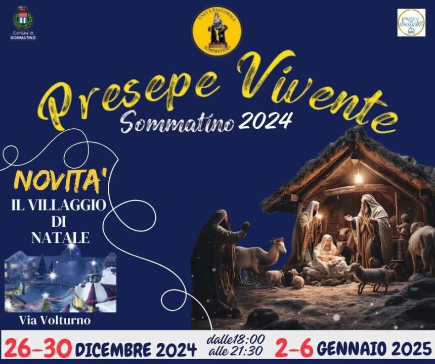Si svolgerà lunedì 30 Dicembre dalle 18.00 alle ore 21.00 la seconda delle quattro giornate del Presepe vivente a Sommatino. Il percorso itinerante voluto fortemente dall'unità Pastorale di Sommatino con il Patrocinio del Comune di Sommatino vede coinvolte aggregazioni associazioni, confraternite proloco e appassionati. Il percorso prende il via dal Palazzo Museale Cigno nella Piazza Centrale attraversando poi la suggestiva e storica zona di Sommatino. L’ultima tappa del percorso è Palazzo Di Bartolo dove avrà luogo la rappresentazione della Natività. Sempre all'interno del Palazzo Di Bartolo si potrà visitare anche “Sommatino nel Presepe” un Presepe con protagoniste le vie e le Piazze del Paese. Nel tragitto tante e diverse postazioni che rievocheranno gli antichi usi e mestieri, con le diverse botteghe, la scuola e tanti animali. Si potranno fare degustazioni di ricotta, ceci, miele e tanti altri prodotti. Novità di quest'anno il Villaggio di Babbo Natale per i più piccini.