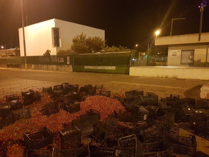 Momenti di tensione stamani intorno alle ore 5 nel piazzale antistante il mercato ortofrutticolo di Vittoria (Ragusa). Alcuni produttori prima dell'apertura dei cancelli hanno rovesciato a terra diverse cassette di pomodoro, considerato il basso prezzo della varietà ciliegino (10/20 centesimi al chilo).