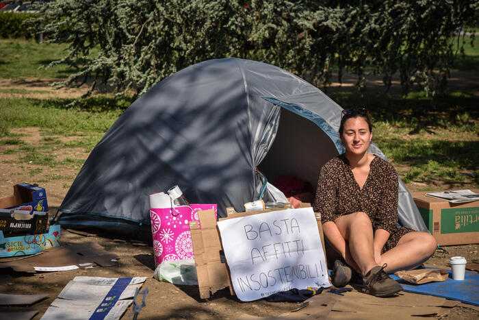 Una tenda piantata in piazza Leonardo da Vinci, di fronte al Politecnico, dove dormirà fino al 7 maggio, per protestare "contro gli affitti insostenibili". E' l'iniziativa di una studentessa di ingegneria ambientale, Ilaria Lamera, sostenuta da Terna Sinistrorsa e raccontata dalla giovane su Instagram. "Da anni a questa parte i costi degli affitti milanesi sono fuori portata. Vivere a Milano significa arrivare a spendere 600 euro (spese escluse) per una stanza singola – spiega Terna Sinistrorsa in un post – Nonostante la situazione sia ormai nota, e ci sia stata apertura da parte delle istituzioni, non sono ancora state previste delle misure in grado di rendere più accessibili gli alloggi milanesi. Per questo motivo Ilaria, studentessa del Politecnico di Milano, ha deciso di piantare la sua tenda in piazza Leonardo Da Vinci per dormire qui, da oggi fino a domenica 7 maggio. La Terna Sinistrorsa è decisa a fare le pressioni necessarie affinché le istituzioni pubbliche, dalla Regione al Governo, intervengano per sanare e risolvere la situazione".