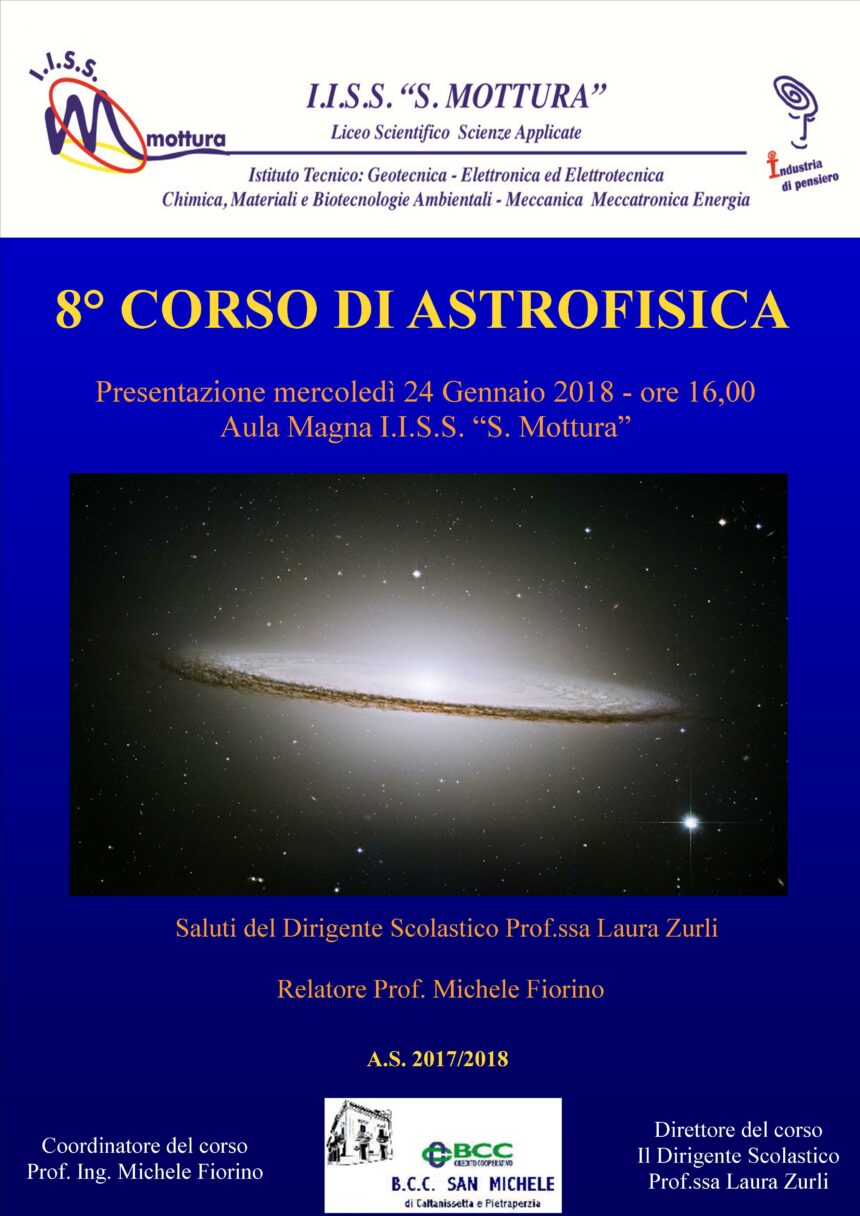 Sarà presentato mercoledì 24 gennaio alle ore 16,00 l' 8° Corso di Astrofisica promosso dall'istituto “Mottura” di Caltanisetta diretto dalla prof.ssa Laura Zurli. L'iniziativa è aperta al territorio e si rivolge in particolare a tutti gli appassionati di astronomia che si pongono domande del tipo: quanto è grande l'universo? qual' è la sua struttura? è finito o infinito? è eterno o ha un inizio e una fine?. Un percorso culturale di 40 ore aperto a tutti, riferisce l'ideatore del corso prof. Michele Fiorino, che attingendo dalla fisica moderna (meccanica quantistica e teoria della relatività) affronta lo studio di stelle, galassie e buchi neri fino alla descrizione dei più moderni modelli cosmologici. Tutto ciò anche attraverso l'analisi dei grandi esperimenti scientifici come LHC di Ginevra che ha portato alla scoperta del bosone di Higgs e più recentemente, alla verifica dell'esistenza delle onde gravitazionali previste da Einstein. Partendo dall'infinitamente piccolo si prenderanno in esame quei segnali di varia natura (radiazione elettromagnetica, raggi cosmici, onde gravitazionali, ecc.) attraverso i quali siamo in grado di ricostruire i processi fisici che avvengono a distanze inimmaginabili dal pianeta terra, alcuni dei quali ancora da comprendere come per esempio l'energia oscura che sta accelerando l'espansione dell'universo. Anche quest'anno il corso si arricchisce della preziosa collaborazione di numerosi esperti esterni (astronomi e docenti universitari) per alcuni momenti di approfondimento e prevede esperimenti di laboratorio (sarà verificata la dilatazione relativistica del tempo di vita dei muoni di origine cosmica) nonché piacevoli serate di osservazione del cielo al telescopio e visite guidate presso realtà astronomiche di rilievo presenti in Sicilia.