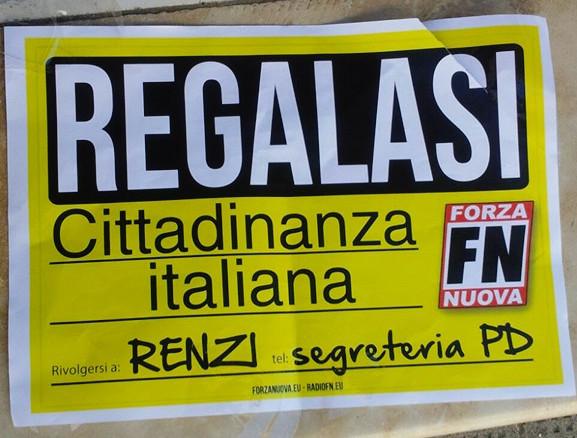 E' arrivata fino a Caltanissetta la protesta dei militanti di Forza Nuova che hanno affisso sul portone della sede del Partito Democratico cartelli polemici sul ddl per la cittadinanza per i minori stranieri approvato la settimana scorsa alla Camera. Sui cartelli compare provocatoriamente la scritta “Regalasi cittadinanza italiana” e l'invito a rivolgersi al premier Matteo Renzi.