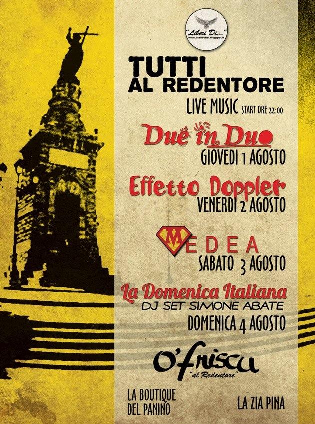 Ecco l'altra faccia del Redentore, il santuario tanto caro a molti nisseni ma tanto offeso, violato e degradato da altri nisseni. L'altra faccia di questo antico e unico promontorio di Sicilia innalzato in onore di Gesù nelle regioni italiane, oggi ha un look diverso da come lo abbiamo lasciato. I comitati di quartiere hanno avuto la capacità di risvegliare la Curia, la Soprintendenza e il Comune perché ritornasse il decoro in questo storico piazzale, perché si restituisse la religiosità di un luogo sacro senza porte e sotto le stelle. Agli interventi che si sono susseguiti in queste settimane – rimozione delle scritte vandaliche sul basamento del monumento, bonifica del sito e la restituzione del panorama mozzafiato dopo l'eliminazione degli alberi di troppo – oggi il Redentore torna a pulsare grazie ad un cartellone di eventi che è stato realizzato da alcuni privati in collaborazione con l'associazione culturale “Liberi di…” e il patrocinio del Comune, che ha già riscosso il plauso dei nisseni per la variegata offerta di appuntamenti. Ènato un chiosco denominato ‘o friscu – non a caso, considerata l'altitudine del monte San Giuliano – curato dai gestori del locale Spazio Rosso che hanno ripulito il piazzale creando un angolo accogliente dove sorseggiare un drink o gustare un gelato, così come hanno fatto i titolari della rivendita La boutique del panino e del chiosco della Zia Pina , “coalizzatisi” per ridare smalto a questo luogo promuovendo la kermesse che giorno 22 agosto si arricchirà con la presenza di Lello Analfino, leader e anima della band “Tinturia”. Basta davvero poco, che ce vo'.