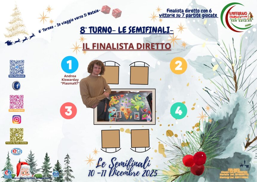 Mercoledì 10 e Giovedì 11 dicembre, dalle ore 20.30 circa, Il Risiko Club Ufficiale “Il Pifferaio” di San Cataldo si prepara a vivere due serate di grande Risiko nella luminosa e scintillante sala della Nuova Locanda della cittadina della provincia nissena, dove i “Pifferai” trovano anche la possibilità di socializzare al tavolo di un’ottima cena, con un abbondante menu’ dedicato ai giocatori del Club che usualmente precede le partite. Si svolgeranno infatti i 3 tavoli di semifinale del 6° Torneo interno “In viaggio verso il Natale”, con i semifinalisti già distribuiti nelle 3 partite sulla base di una griglia già predeterminata con la posizione in classifica al termine del girone di qualificazione.