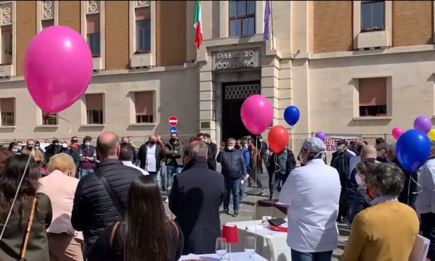 Ristoratori in piazza con i tavoli apparecchiati davanti alla Prefettura di Enna. La manifestazione "Mai più chiusi", organizzata dai ristoratori ennesi ha visto la partecipazione di oltre 200 persone tra partite iva, proprietari di palestre, di cinema, il mondo dello spettacolo, le lavanderie, i bar, gli alberghi, gli agriturismi, i b&b, le discoteche, gli Ncc, le agenzie di viaggio, le guide turistiche, le pizzerie, i teatri, i fotografi, ma anche persone della società civile, arrivati anche da fuori provincia per chiedere al governo nazionale l'eliminazione del coprifuoco e dei colori che condizionano l'andamento della vita economica.