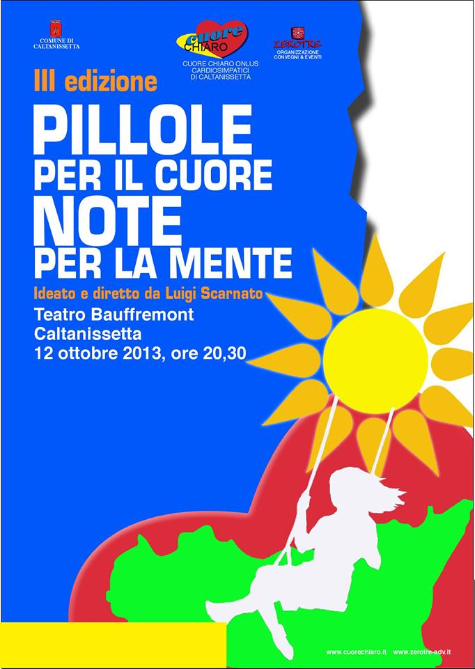 Dopo il successo delle edizioni 2011 e 2012 si lavora alla terza edizione della manifestazione “Pillole per il cuore, note per la mente”, spettacolo educazionale ideato e condotto dal cardiologo nisseno Luigi Scarnato. L’evento previsto per il 12 Ottobre al teatro Bauffremont di Caltanissetta ed organizzato come di consueto dalla ZeroTre di Michele Ferraro ed Ivo Turco si pone l’obiettivo di trasmettere messaggi atti a promuovere uno stile di vita sano e coretto, diffondendo la necessità delle prevenzione delle malattie cardiovascolari e non solo. Con una durata di circa due ore la manifestazione “pillole per il cuore, note per la mente” prevede momenti di spettacolo ed intrattenimento alternati a “pillole” educazionali sul vivere sano, con interventi qualificati di medici e professionisti, capaci di testimoniare in maniera chiara ed accessibile rischi e conseguenze di condotte di una vita sregolata. Padrone di casa sarà l’affermato cardiologo nisseno Luigi Scarnato, presidente dell’Associazione Cuore Chiaro Onlus. Quasi definito intanto il cast di artisti che daranno il proprio contributo alla manifestazione. “L’evento sta diventando un appuntamento fisso ormai della nostra comunità –sostiene il cardiologo Luigi Scarnato- noi ne siamo orgogliosi perché grazie ad un simile momento di aggregazione riusciamo a coniugare aspetti scientifici e ludici grazie al fatto che forse tra una risata ed un’altra, i messaggi importanti arrivano meglio. Il nostro obiettivo è sempre quello di cercare di inculcare ad una sempre crescente fascia di popolazione che uno stile di vita sano, aiuta a vivere meglio e – conclude Scarnato- a prevenire l’insorgenza delle malattie”