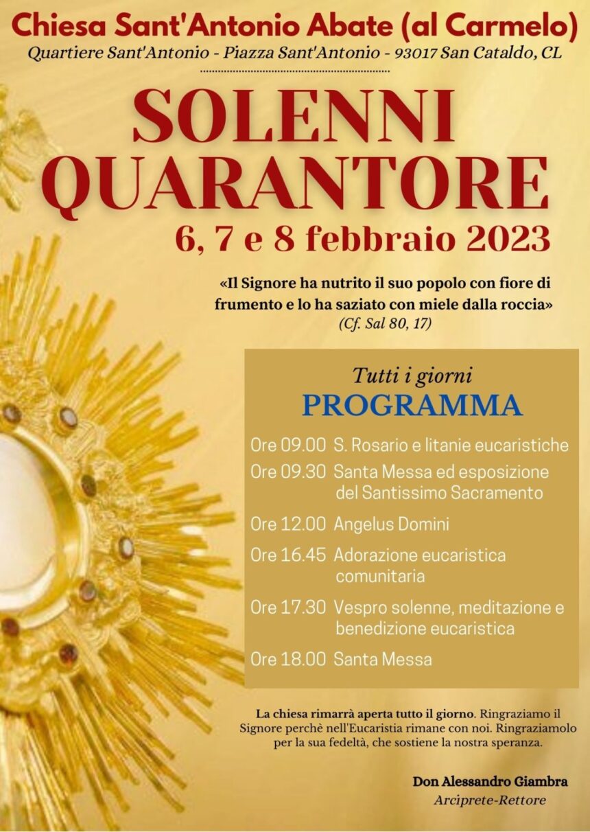 Anche quest'anno, il 6, 7 e 8 febbraio, nella piccola chiesetta di Sant'Antonio Abate (al Carmelo) vicino il carcere, si svolgeranno le sacre Quarantore. Un appuntamento atteso dal quartiere e da tanti sancataldesi che hanno a cuore il piccolo tempio mariano dove è venerata la Madonna del Carmelo. In questi tre giorni alle ore 9.30 l'Arciprete celebrerà la Santa Messa e a seguire sarà esposto il Santissimo Sacramento. La chiesa rimarrà aperta tutto il giorno per la preghiera e l'adorazione eucaristica personale. I rintocchi delle campane – come da tradizione a San Cataldo – ricorderanno che il Santissimo Sacramento è esposto solennemente. Alle ore 16.45 ci sarà l'adorazione eucaristica comunitaria, alle ore 17.30 il canto del Vespro e alle ore 18.00 sarà celebrata la Santa Messa parrocchiale (in Chiesa Madre, per questi tre giorni non sarà celebrata l'Eucaristia serale delle ore 18.00).