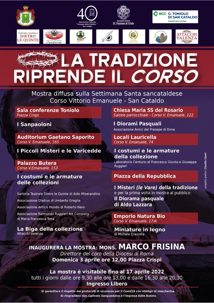 Un modo originale per coniugare storia, tradizione, arte e bellezza ma anche, e soprattutto, per alimentare amicizia e collaborazione tra i tanti appassionati della festa più sentita. Trattasi di un percorso che si snoderà in più locali collocati lungo il corso Vittorio Emanuele, l’antico “stratuni di la chiazza”, e che consentirà ai visitatori di ammirare, in più aree espositive tutto ciò che ruota attorno alla Settimana Santa sancataldese: I Sampauluna, le Vare, le Varicedde, i Piccoli Misteri, i Diorami pasquali, i costumi degli attori delle sacre rappresentazioni e le collezioni di armature e panoplie, e, con esse, bighe e accessori vari. E, ancora, le piccole artistiche miniature in legno dei Misteri e dei Sanpaoloni e tutto ciò che possa, in qualche modo, riportarci ai giorni della Passione.