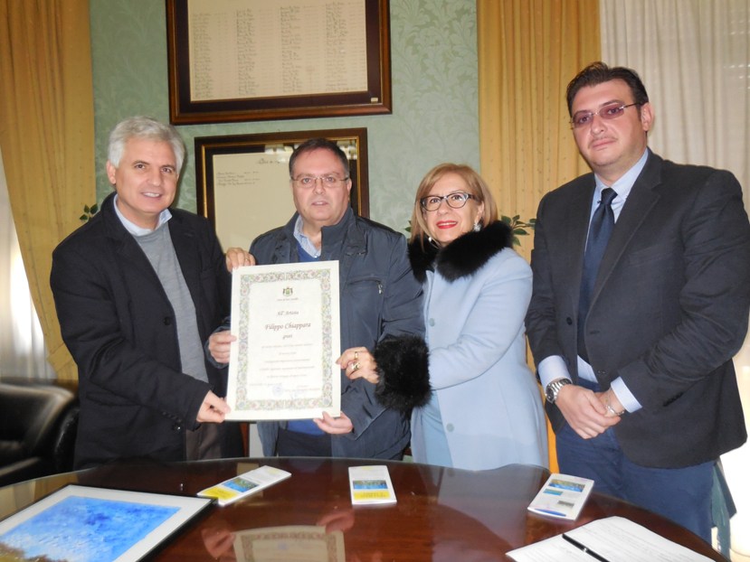 Riconoscimento per il pittore Filippo Chiappara, ricevuto dal Sindaco Giampiero Modaffari e dall’Assessore alla Cultura Maria Concetta Naro al Palazzo delle Spighe di San Cataldo, per la consegna di una pergamena recante un Attestato di merito. Filippo Chiappara è un pittore sancataldese non di nascita, ma di adozione: questi, infatti, ha cinquantaquattro anni (nativo di Aragona) e da circa quaranta vive in città; ha frequentato l’Istituto d’Arte “Juvara”. Ha poi conseguito il titolo di Maestro d’Arte e la Maturità di Arte Applicata per poi iscriversi all’Accademia di Belle Arti “Michelangelo” di Agrigento. Consegue nell’anno 1987 il Diploma nella Sezione Pittura. L’artista vanta mostre ed esposizioni Nazionali e Internazionali. Ha affermato il Sindaco Giampiero Modaffari: <