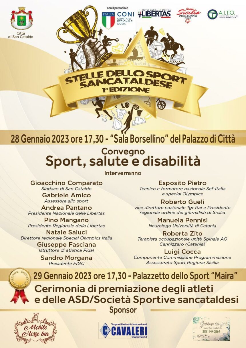 “Altre importanti personalità interverranno durante il convegno, – continuano Comparato e Amico – tra cui il presidente nazionale delle Libertas Andrea Pantano, il presidente regionale della Libertas Pino Mangano, il direttore regionale di Special Olympics Italia Natale Saluci, il tecnico e formatore nazionale Sef-Italia e Special Olympics Pietro Esposito, il presidente FIGC Sandro Morgana, il vice direttore nazionale Tgr Rai e presidente regionale dell'Ordine dei Giornalisti di Sicilia Roberto Gueli, la neurologa Manuela Pennisi, la terapista occupazionale Roberta Zito e il componente della Commissione programmazione dell’Assessorato Sport Regione Siciliana Luigi Cocca.Il giorno successivo, domenica 29 gennaio, alle ore 17:30, presso il Palazzetto dello Sport Maira di San Cataldo, si terrà la premiazione degli atleti sancataldesi e il riconoscimento di tutte le ASD/Società Sportive del territorio. Ringraziamo quindi Salvatore Citrano e Aldo Tirrito quali organizzatori dell’evento e gli sponsor Mobile Horse, Cavaleri Trasporti e Il Giardino dei Fiori”.