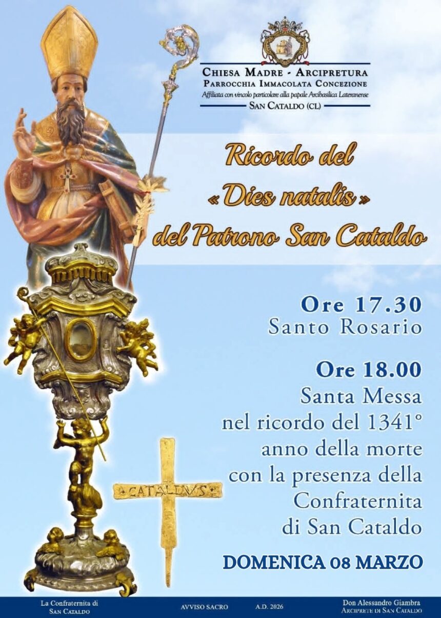 Domenica 8 marzo la Città di San Cataldo celebrerà il ricordo della morte terrena del suo Santo Patrono, ricorrenza che quest'anno segna il 1341° anniversario di quell'evento. Nella tradizione della Chiesa il “dies natalis” indica il giorno della nascita al cielo di un santo: un momento che viene custodito come memoria viva della sua testimonianza di fede e del suo cammino terreno. In questa occasione anche la comunità sancataldese rinnova il proprio legame spirituale con San Cataldo, figura alla quale la Città deve il suo stesso nome. Alle ore 18.00 si svolgerà la Celebrazione Eucaristica, alla quale prenderà parte la Confraternita di San Cataldo.