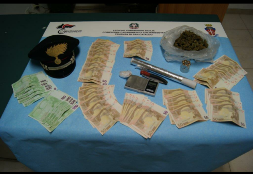 I Carabinieri hanno esteso poi la perquisizione nella sua abitazione di San Cataldo, dove sono stati rinvenuti oltre 100 grammi di marijuana e più di 5.000 euro in contanti nascosti nella sua cameretta.