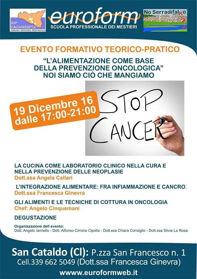 Si svolgerà il 19 dicembre, a San Cataldo, presso la sede formativa della Scuola Professionale dei Mestieri “Euroform” in piazza San Francesco 1, dalle17 alle 21 un importante evento formativo: “L'alimentazione come base della prevenzione oncologica”. L'iniziativa, patrocinata dall'ASP di Caltanissetta e dall'Associazione NoSerradifalko, è stata promossa dalla dottoressaAngela Callari e dalla farmacista nissena Francesca Ginevra, che rispettivamente tratteranno le tematiche de “La cucina come laboratorio clinico nella prevenzione delle neoplasie” e “L'integrazione alimentare tra infiammazione e cancro”. All'evento formativo teorico-pratico, interverrà anche la dottoressa Paola Argento, mentre ai fornelli lo Chef Angelo Cinquemani, darà il via all'attività laboratoriale su “Gli alimenti e le tecniche di cottura in oncologia” e a seguire i partecipanti prenderanno parte alla degustazione. L'organizzazione della manifestazione è stata curata da Angelo Iannello, sociologo, Alfonso Cirrone Cipolla, dirigente medico igienista ASP Caltanissetta , Chiara Consiglio, Psicologa, Silvia La Rosa (tutor delle attivita' formative della scuola Euroform)