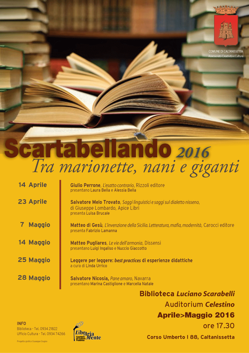 Ricomincia per il secondo anno la rassegna di libri e letture Scartabellando, tra marionette, nani e giganti. La rassegna, che vede ancora una volta protagonista il valore dei testi come cibo e alimento per la formazione, nasce in sinergia tra l’Assessorato alla Creatività e Cultura e il Comitato Librariamente, organizzatore della manifestazione letteraria “Sicilia dunque penso”.