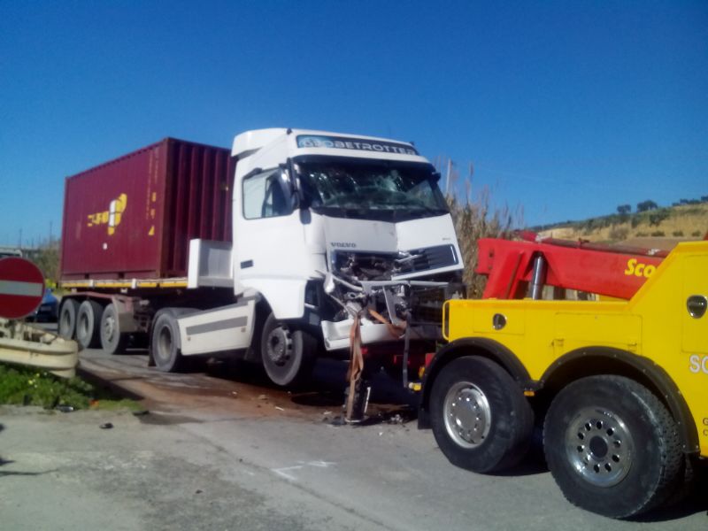 E' di un ferito lieve il bilancio di un violento scontro fra due camion avvenuto oggi sulla Ss 115 Gela-Vittoria, nei pressi del cimitero Farello di Gela. Non è ancora chiare come i due camion siano entrati in collisione. Un impatto frontale che ha mandato in ospedale un trentasettenne gelese, S. F., che a causa dell'urto ha sbattuto contro il parabrezza del mezzo pesante che guidava, riportando un trauma facciale. Soccorso dal personale del 118, l'autotrasportatore è stato trasferito all'ospedale di Gela e medicato. Le sue condizioni non sono gravi. Sul posto, per i rilievi, sono intervenuti i poliziotti della Stradale di Caltanissetta e del distaccamento gelese.