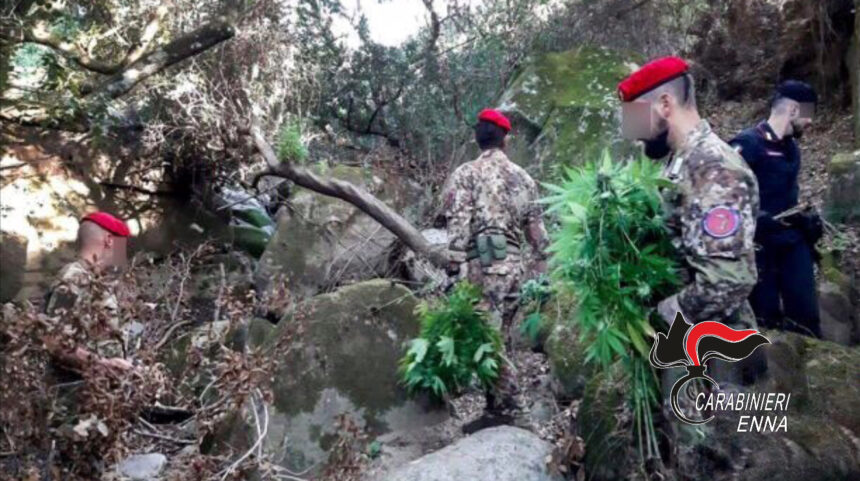 Costanti sono le attività di monitoraggio del territorio ennese da parte dell’Arma dei Carabinieri finalizzate a contrastare quelle forme di delittuosità che trovano più facile sviluppo in quelle aree più impervie. In tale ottica l’impegno dei reparti territoriali viene consolidato con l’impiego dello Squadrone Eliportato Cacciatori “Sicilia” con base a Sigonella, in provincia di Catania e addestrato ad operare proprio in contesti rurali. Tale sinergia ha portato alla individuazione di una piantagione di marijuana allestita nelle campagne di Centuripe e composta da circa ottanta piante dell’altezza di un metro e mezzo. I militari grazie ad un attento servizio di osservazione riuscivano a scovare la piantagione mimetizzata in una proprietà privata abbandonata, tra alberi di ulivo, e a bloccare due persone, un 31enne del luogo e un 50enne catanese intenti ad innaffiare la coltivazione illecita.