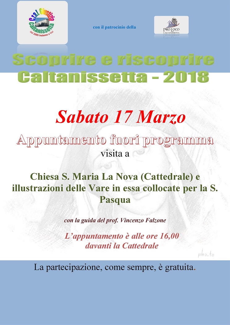 Nell’ambito dell’iniziativa “Scoprire e riscoprire Caltanissetta”, giunta quest’anno alla sua 11^ edizione, organizzate dal CRAL Giustizia Caltanissetta, presieduto da Calogero Occhipinti, sabato 17 marzo, aderendo alle numerose richieste, è previsto un appuntamento fuori programma organizzando la visita guidata alla Chiesa di S. Maria La Nova (Cattedrale) nella quale, in occasione delle celebrazioni della Santa Pasqua, saranno ospitate le vare la cui storia verrà illustrata, insieme alle bellezze della chiesa, dalla nostra competente guida prof. Enzo Falzone. Partecipare e coinvolgere i ragazzi è un ottima occasione per permettere ai giovani di conoscere la storia della nostra città e delle sue tradizioni. L’appuntamento è alle ore 16,00 davanti la Cattedrale. La partecipazione, destinata a tutti coloro che amano Caltanissetta (soci e non soci del CRAL), è, come sempre, gratuita. Ulteriori informazioni sono reperibili sulla pagina facebook del CRAL www.facebook.com/CRAL-GIUSTIZIA-CALTANISSETTA. Il Presidente del CRAL Calogero Occhipinti