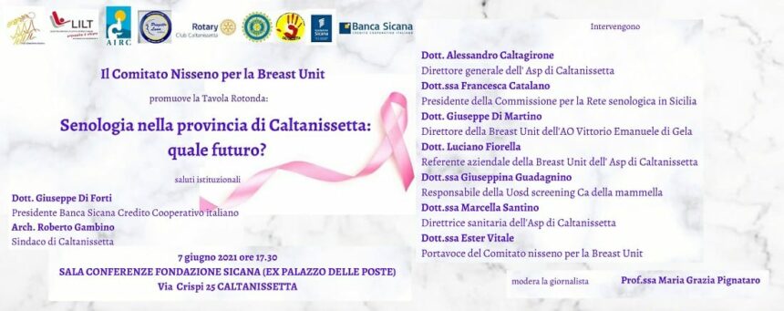 Si svolgerà domani pomeriggio alle 17.30 presso la sala conferenze della Fondazione Sicana (ex Palazzo delle poste) e in diretta dalla pagina facebook di Onde donneinmovimento, la Tavola rotonda sul tema “Senologia nella provincia di Caltanissetta: quale futuro?” La manifestazione, #senologiacl, è stata promossa ed organizzata dal Comitato Breast Unit di Caltanissetta, composto da Associazioni e Club Service come: Onde donneinmovimento, Airc, Lilt, Progetto Luna, Coordinamento nisseno contro la violenza sulle donne, Rotary club ed Innerwheel.