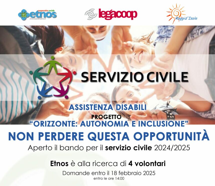 Nel 2025 la cooperativa sociale Etnos di Caltanissetta accoglierà all'interno della struttura “Raggi d'Isole” 4 volontari del Servizio civile universale. La presidenza del Consiglio ha infatti accolto il progetto di assistenza ai disabili “Orizzonte: autonomia e inclusione”. Il servizio civile è rivolto ai giovani tra i 18 e i 29 anni non ancora compiuti. Le domande potranno essere presentate fino alle ore 14 del 18 febbraio. Per consultare il bando e candidarsi bisogna accedere al seguente link https://www.legacoopsicilia.it/bando-servizio-civile-2024