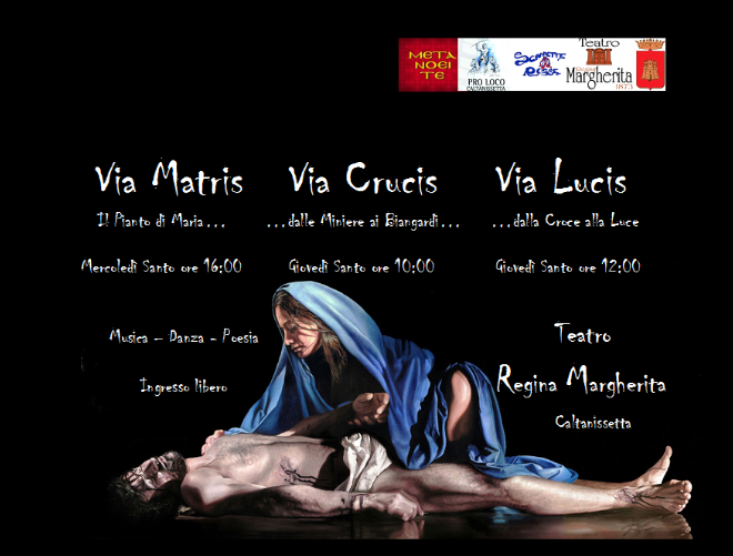 L'idea di un luogo di cultura aperto per la Settimana Santa. Un progetto semplice ma ambizioso, arricchire le giornate della Settimana Santa con un piccolo ma intenso palinsesto di manifestazioni presso il teatro Regina Margherita, gioiello della città. Il palcoscenico si apre nell'attesa che l'intero centro storico si trasformi in palcoscenico, proprio in quegli orari in cui non vi sono manifestazioni, per offrire anche qualche momento di silenzio e cultura ai turisti che cercheranno nelle strade di Caltanissetta di vivere qualcosa di importante… “Via Matris”, “Via Crucis”, “Via Lucis”. Momenti di prosa, musica, danza, poesia che coinvolgeranno diverse scuole, associazioni, scuole di danza e compagnie teatrali, che Mercoledì e Giovedì Santo daranno vita all'antico teatro della città, prendendo possesso anche di quell'identità storico e religiosa che i nisseni possiedono, sopratutto in questi giorni colmi di riti, coinvolgendo sopratutto le nuove generazioni per far loro vivere la città e la sua Settimana Santa da protagonisti. Si inizierà con “Via Matris” alle 16:00 del Mercoledì Santo, proseguendo con Via Crucis alle 10:00 e Via Lucis alle 12:00 del Giovedì Santo. Ad accogliere, anche il Diorama di Pasqua che sarà allestito all'ingresso del teatro. La manifestazione è patrocinata dal Comune di Caltanissetta, assessorato alla Cultura e dalla Pro Loco.