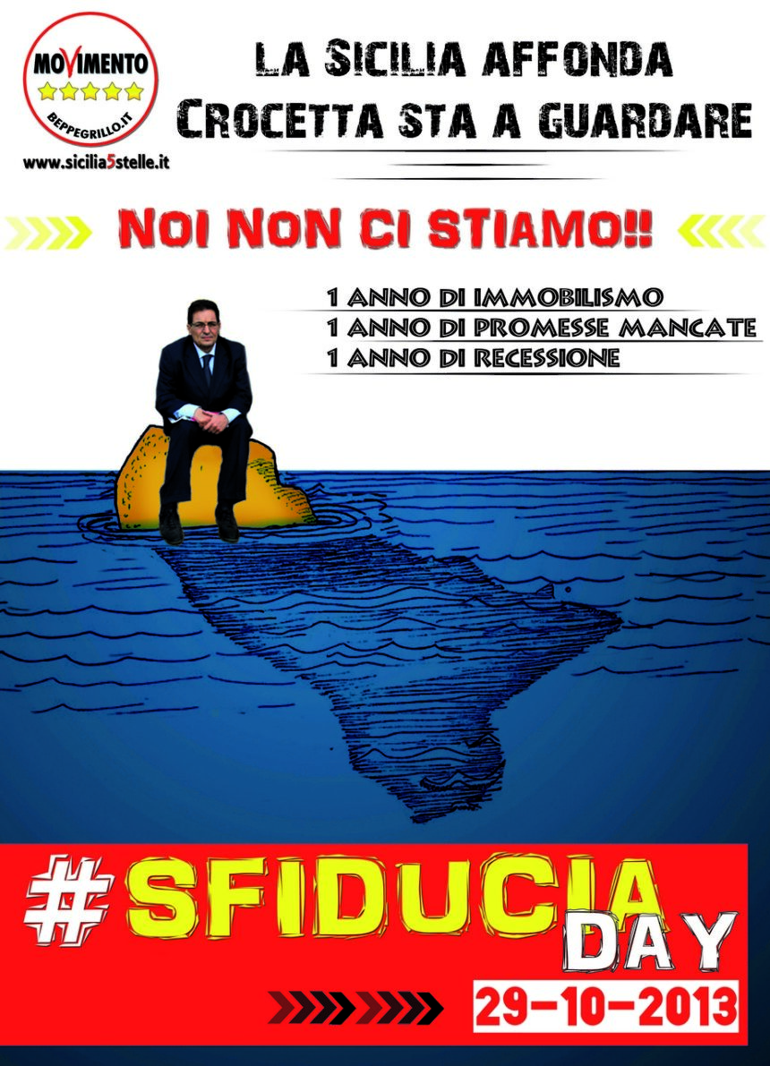 Il popolo “5 Stelle” si mobiliterà nel prossimo weekend per informare i siciliani sulle ultime vicende dell'Ars, dove martedì prossimo si discuterà la mozione di sfiducia al presidente della Regione, Rosario Crocetta, presentata dal Movimento 5 Stelle. Ai cittadini, gli attivisti consegneranno materiale “che illustra il percorso che ha portato la base del Movimento a chiedere la sfiducia al governatore, bravissimo nei proclami, molto meno ad affrontare e a risolvere i veri problemi della regione”. Il là alla mozione presentata dai deputati 5 Stelle è arrivato tramite una votazione on line degli attivisti del Movimento: oltre il 90% dei votanti infatti si è espresso per la rimozione del presidente.