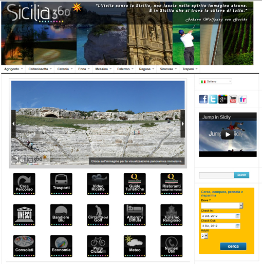 Il portale consultabile all'indirizzo www.sicilia360.it offre numerosi motori di ricerca, informazioni su mezzi di trasporto e alberghi, dando una visione completa sull'isola (a 360 gradi, appunto) che comprende anche la filiera dell'agroalimentare e dell'industria culturale. Tradotto in inglese, spagnolo tedesco e francese, il portale è ricco di immagini tra cui le fotografie panoramiche e immersive che, attraverso un click, consentono al visitatore di ritrovarsi all'interno di quei siti che testimoniano la ricchezza artistica e culturale dell'Isola. Visionabile anche su tablet e smartphone, Sicilia360.it dispone anche dei collegamenti con i più importanti social network del web.