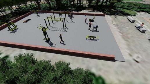 La zona individuata è quella del rettangolo di gioco, un tempo previsto per pattinaggio a rotelle, di 260mq all’interno della Villa Comunale di San Cataldo. In questa zona è stato sviluppato un modello progettuale che prevede n. 1 Circuito Corpo libero di tipo “medium” (per almeno 5 utilizzatori in contemporanea) e n. 6 macchine, anche polivalenti, per l’allenamento isotonico e cardio. Il target cui sono destinati gli attrezzi per allenamento è variegato, dai bambini agli adulti, con particolare attenzione rivolta agli over 65 e disabili.