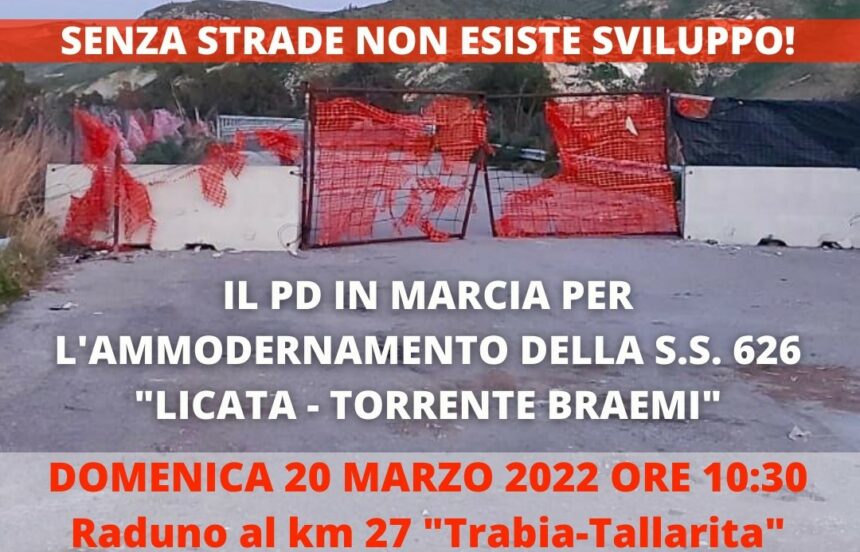 Il Partito Democratico delle province di Caltanissetta e Agrigento, i circoli dei comuni ricadenti nella valle del Salso, chiedono un intervento immediato, finalizzato al completamento definitivo dell’opera che consentirà il collegamento all’asse autostradale Palermo-Catania. A tal proposito, è in programma un’iniziativa pubblica che si terrà a il 20 marzo, sulla strada statale 626, nel tratto incompleto nei pressi della miniera Trabia Tallarita, al fine di sensibilizzare i governi nazionale e regionale e l’Anas affinché si adoperino in tempi certi e brevi, per il completamento dell’opera.