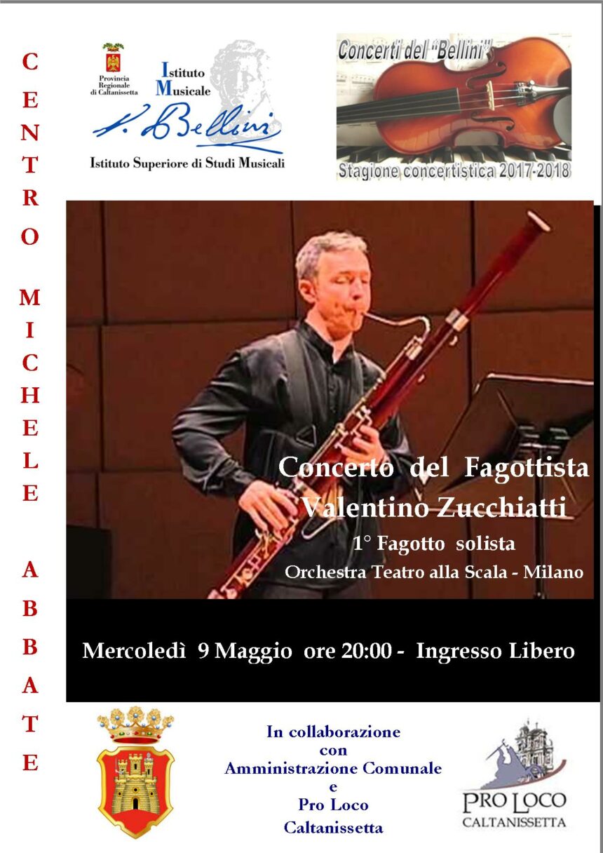 Con il Concerto del Fagottista Valentino Zucchiatti, 1° Fagotto solista dell’ Orchestra del Teatro alla Scala di Milano che avrà luogo mercoledì 9 Maggio alle ore 20:00 con ingresso libero, sino ad esaurimento posti, al Centro Culturale “Michele Abbate prosegue la Stagione concertistica del “Bellini”.