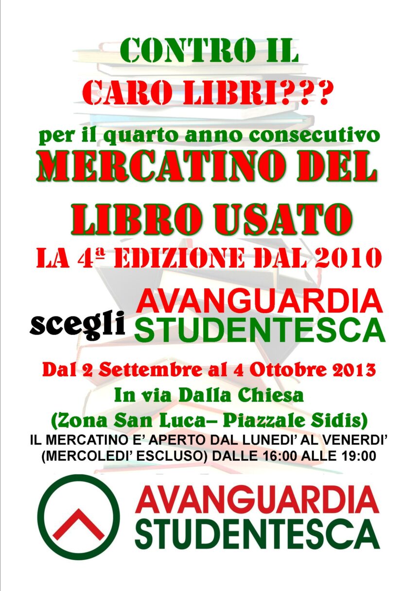 Anche quest'anno Avanguardia Studentesca continua la sua guerra al caro libri e per il quarto anno consecutivo lancia il “Mercatino del libro usato”, che dà alle famiglie nissene un notevole aiuto per far fronte all'acquisto dei testi scolastici di Scuola Superiore. Come ha riportato dal Codacons, anche quest'anno si è registrato un aumento del prezzo dei testi scolastici del 5%; tutto ciò è aggravato dal fatto che le case editrici producono sempre nuove edizioni e puntualmente sono queste che vengono richieste agli studenti, non permettendo loro di acquistare le vecchie edizioni e di conseguenza facendo lievitare le spese delle famiglie. L'iniziativa prenderà il via lunedì 2 settembre fino al 4 ottobre, aperti dal lunedì al venerdì (mercoledì escluso) dalle 16:00 alle 19:00. Il mercatino sarà allestito in via Dalla Chiesa, nei locali del Comitato San Luca, di fronte la Parrocchia, accanto al parcheggio del “Sidis”. Le famiglie degli studenti nisseni si potranno recare al mercatino sia per vendere i loro “vecchi libri” guadagnando qualche euro per le successive spese scolastiche e sia comprare i libri di seconda mano a prezzi ridottissimi.