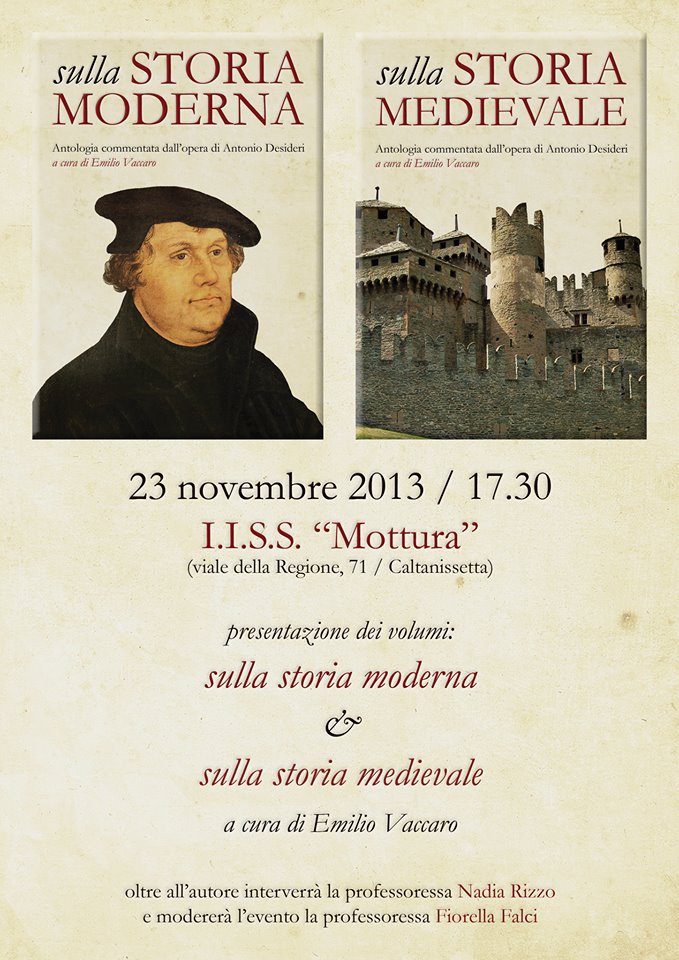 Nuovo lavoro, dopo il saggio su John Kennedy, per il giornalista e storico nisseno Emilio Vaccaro, che presenta il prossimo 23 novembre nell’aula magna dell’Istituto “Sebastiano Mottura” i libri “Sulla storia moderna” e “Sulla storia medievale”, due volumi dell’antologia commentata dall’opera di Antonino Desideri, autore del manuale di storia che è stato uno dei testi di riferimento per intere generazioni di studenti e docenti dei licei. Alla presentazione interverrà la docente Nadia Rizzo; moderatore dell’incontro Fiorella Falci, docente di storia e filosofia del liceo classico Ruggero Settimo. L'incontro si terrà alle ore 17.30.