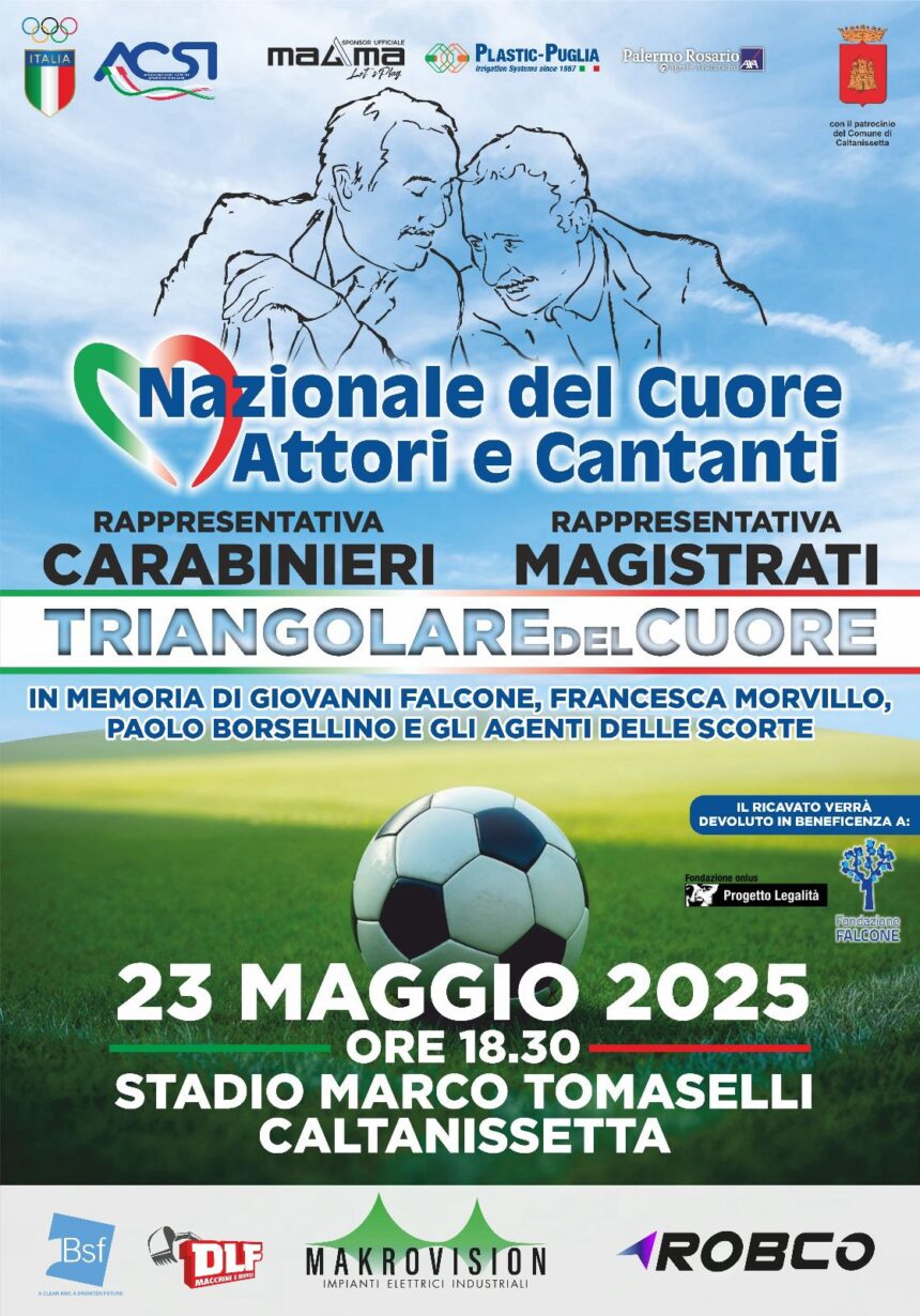 Il prossimo 23 maggio 2025, dalle ore 18:30, lo stadio Marco Tomaselli di Caltanissetta ospiterà il “Triangolare del Cuore”, un evento sportivo e non solo, di alto valore simbolico che vedrà scendere in campo le rappresentative di Magistrati e Carabinieri insieme alla Nazionale del cuore Attori e Cantanti, della quale era capitano l'indimenticato Totò Schillaci.